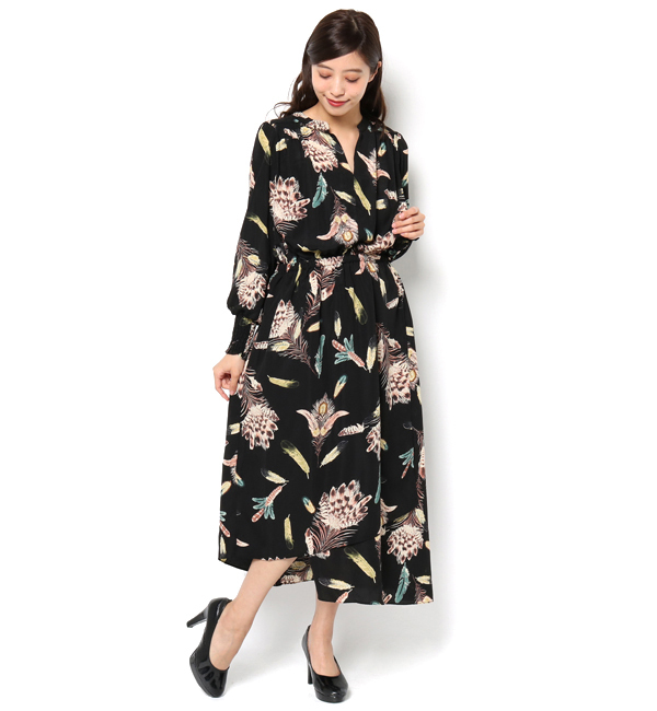 【送料無料】 Antigraviteでは珍しい全体に柄をあしらったワンピース。「羽」の柄を使用。ポリエステル100%でシワになりにくく、着心地も軽やか。軽いながらも薄すぎない素材感。中にタートルニット重ねたり、ブーツと合わせると今の時期でも着用して頂けます。裾に向かって綺麗に広がるスカートラインと、ウエストマークが大人のシルエット。カジュアルから軽めのパーティーシーンまで活躍します。 アンティグラヴィテ/Antigravite Antigravite|ワンピース|ワンピース,ドレス