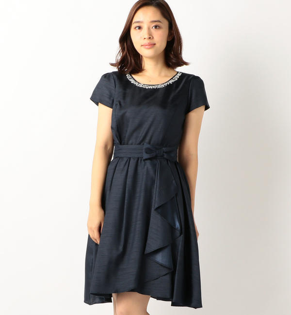 【送料無料】 リボンのオン/オフで異なるテイストにアレンジできる2WAYフレアドレス。リボンをオンすればゴージャスな印象に、オフすれば洗練された大人っぽい雰囲気になります。リボンをオフした際には、付属のビジューブローチでさりげなくドレスアップできます。 ミッシュマッシュ/MISCH MASCH ワンピース|ドレス