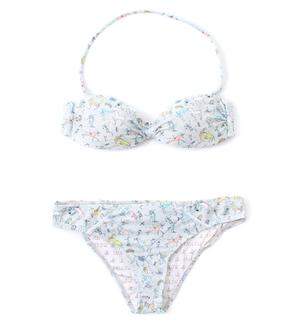 【送料無料】 優しい色使いでキャッチーなユニコーン柄をプリントしたセットアップビキニ。リボン風にアレンジされたバンドゥブラや、ボトムの切り替えデザインなど、注目ポイントが満載です。シースルータイプのトップスを合わせたり、パーカーを羽織ればオリジナルのコーディネートも楽しめます。 サンアイミズギラクエン/三愛水着楽園 水着・スポーツ|ビキニ